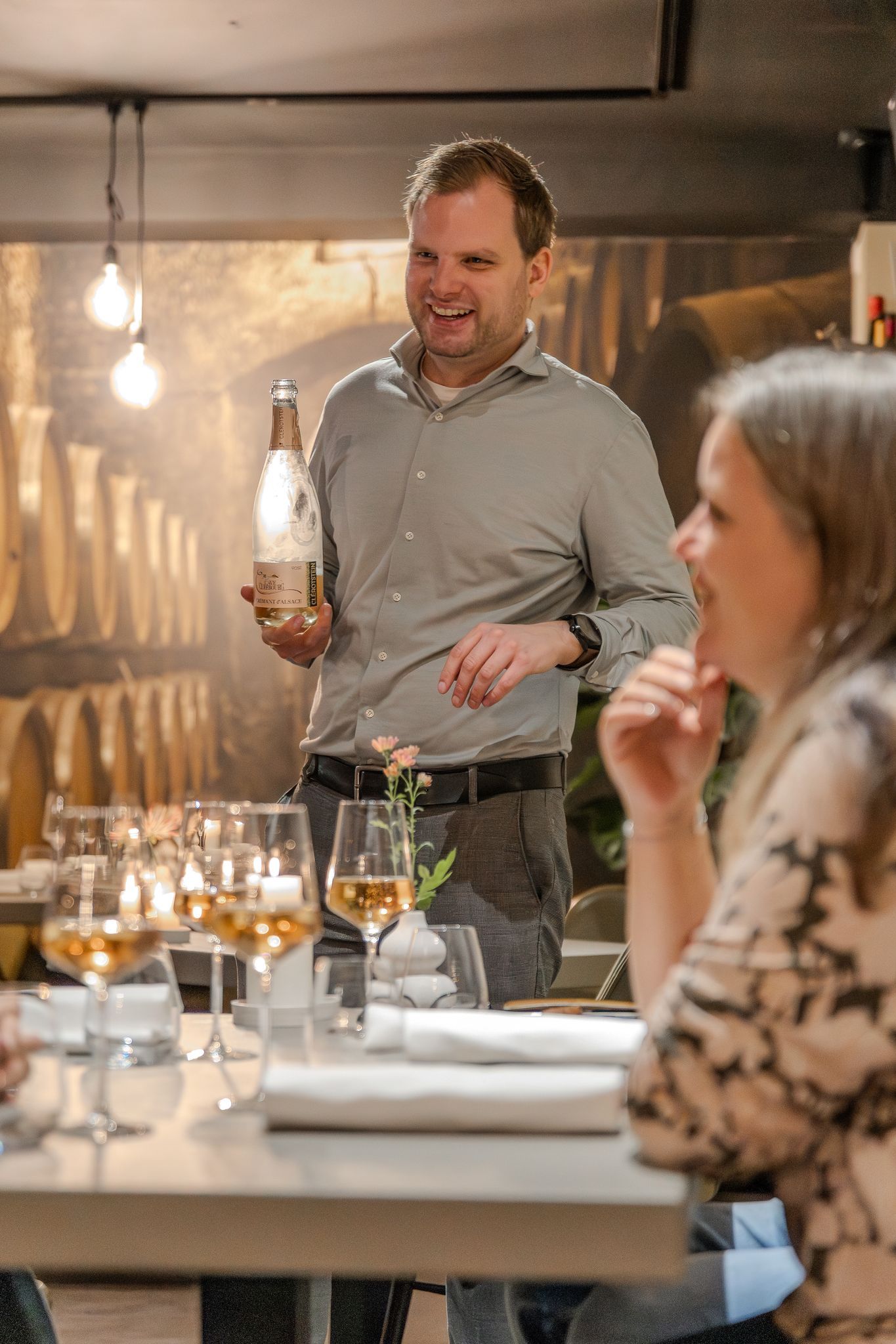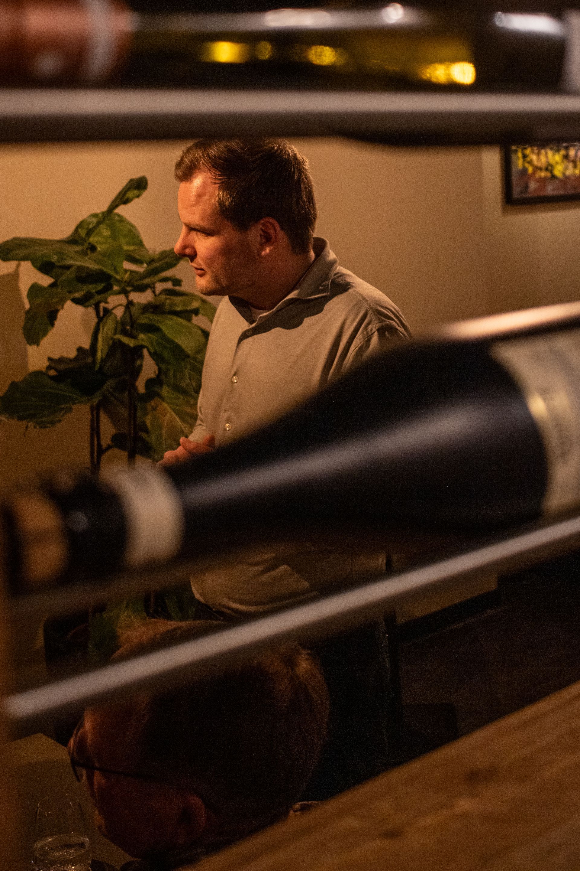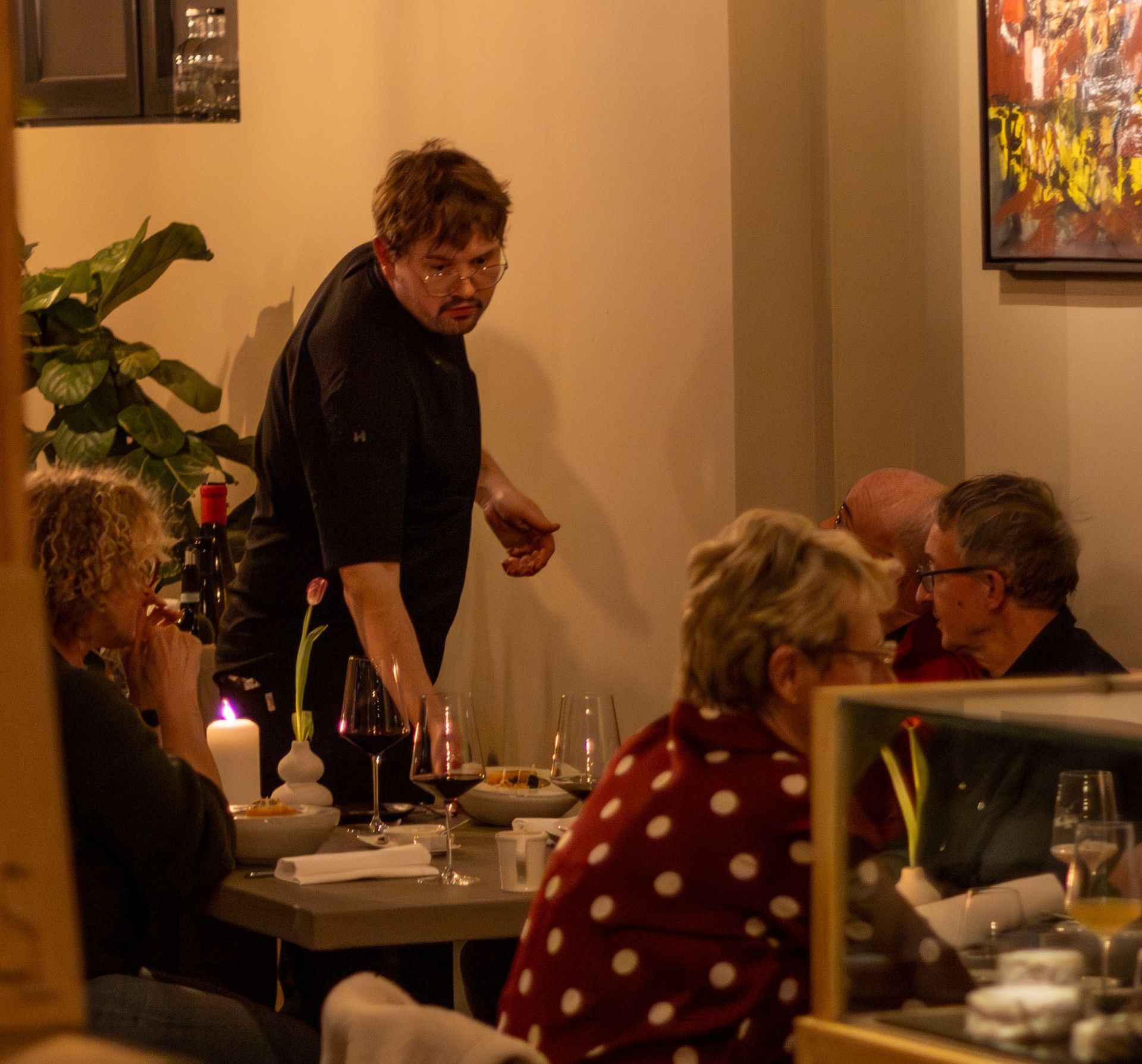 In de bediening heeft sommelier Koen Kuipers de leiding. Zijn wijnkaart is zeer gevarieerd, zonder extreem lang te zijn. Alle belangrijke Europese streken zijn vertegenwoordigd maar niet met de gekende regionale toppers maar juist met veel onbekende wijnmakers. Koen: ‘Ik koop graag bij kleine gespecialiseerde importeurs, die met wijnen komen die erg goed zijn van wijnboeren waarover ik een verhaal kan vertellen. Ik ga regelmatig met het Nederlands Gilde van Sommeliers op wijnreis, onlangs nog naar het sherry gebied en Mallorca, en die ervaringen verwerk ik ook in de wijnkaart. Uit Mallorca heb ik nu drie fantastische wijnen van Finca Can Gelat, een bedrijf van een Nederlands stel. En in het Zuid-Duitse Baden heb ik de Chardonnay van het biodynamische bedrijf Rieger ontdekt. Ik wil mijn gasten graag dingen laten proeven die ze thuis of elders niet kunnen proeven. En ik beperk me graag tot Europa omdat er hier nog zoveel te ontdekken valt. Ook van heel dichtbij zoals het België of Nederland.’